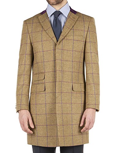Aston&Gunn began as a Gentlemanâ€TMs Outfitter of distinction in the historic English market town of Stamford. Today the collection combines the finest quality cloths and superb attention to detail to provide garments which demonstrate the finest traditions of British menswear style. With great features and a striking two colour check, this country style overcoat is a great addition to any manâ€TMs wardrobe and is sure to make an impression. Cut from a green textured weave 100% wool cloth and in a regular fit it is both warm and comfortable. Covered buttons adorn the cuff whilst the fly front helps to preserve a sleek look. Further detailing includes the contrast purple velvet collar and blue melton under collar, two handy internal pockets three external pockets. Cloth Composition: 100% Wool